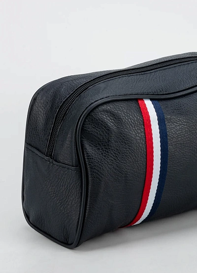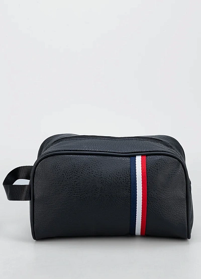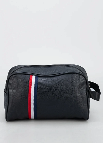 Универсальная мужская косметичка компактных размеров выполнена в тёмно-синей гамме с элементом в виде контрастной полосы триколор. Модель оснащена удобной ручкой сбоку и застёжкой на молнию, что обеспечивает лёгкий доступ к содержимому.