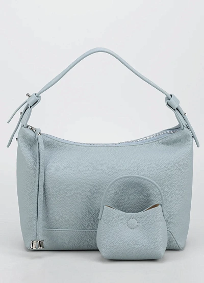 Женская сумка лаконичного дизайна представлена в светло-голубой цветовой гамме. Модель выполнена с одной ручкой и дополнена маленькой сумкой-вкладышем в тон. Дизайн отличается плавными линиями и минималистичным оформлением.