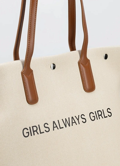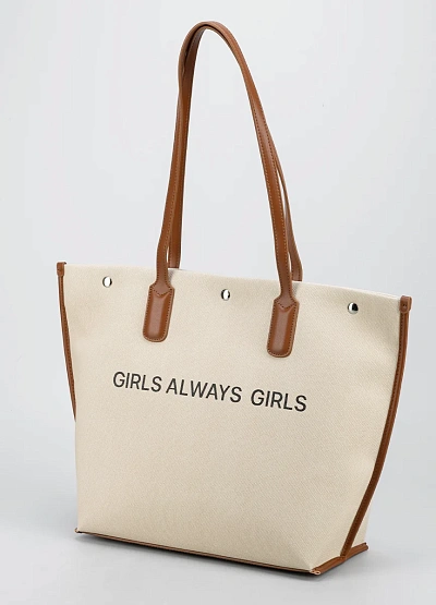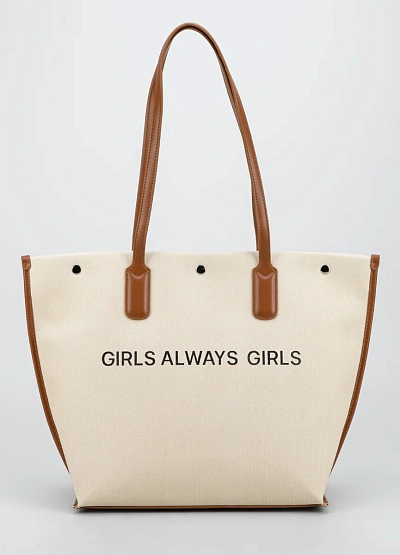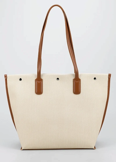 Женская сумка светлого оттенка с контрастными коричневыми ручками рассчитана на повседневное использование. Просторная форма и надпись на фронтальной части делают модель узнаваемой. Элементы крепления ручек и окантовка отличаются по цвету.