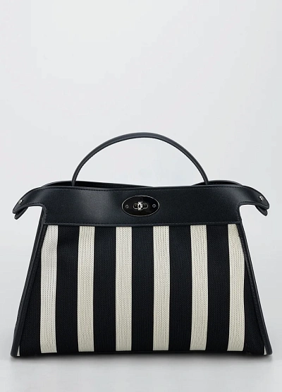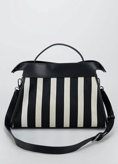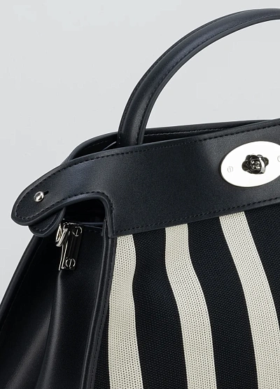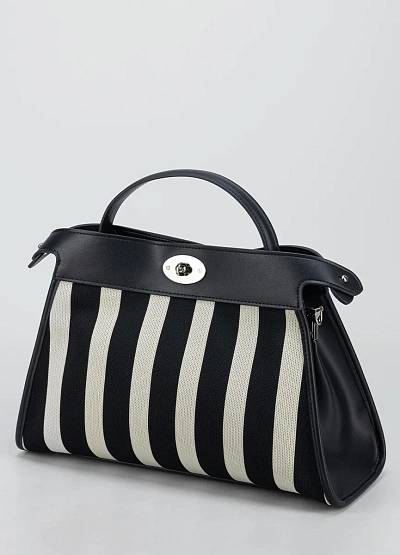 Женская сумка в контрастной чёрно-белой гамме с характерным вертикальным полосатым узором. Модель отличается жёсткой структурой, короткой ручкой и металлической поворотной застёжкой на клапане.