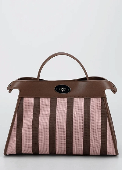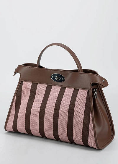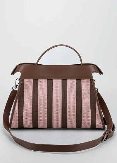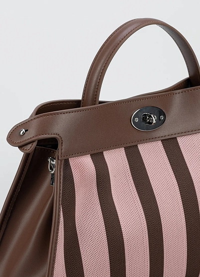 Женская сумка, выполненная в комбинации коричневого и светло-розового оттенков, с ярко выраженным полосатым принтом. Модель оснащена верхней ручкой и жестким каркасом, что подчеркивает ее структурированную форму.