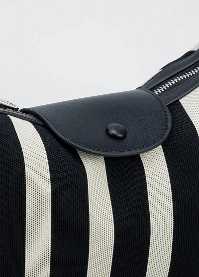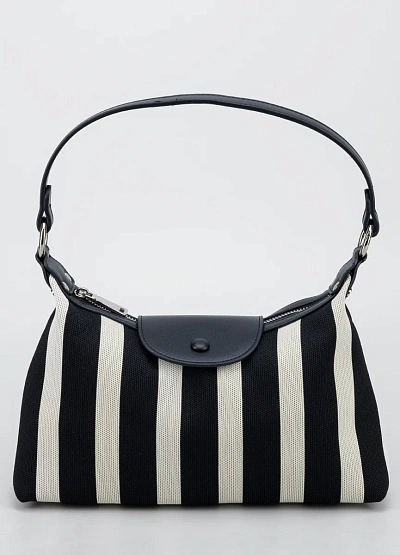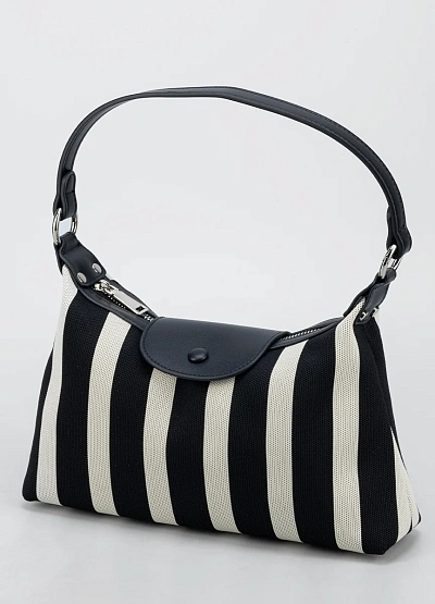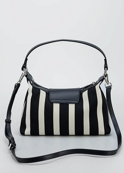 Женская сумка с короткой ручкой представлена в чёрно-белой полосатой расцветке. Модель выполнена в лаконичном стиле с контрастными вертикальными полосами и аккуратным клапаном на кнопке.
