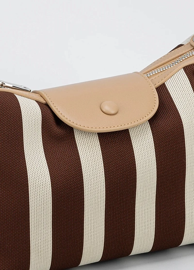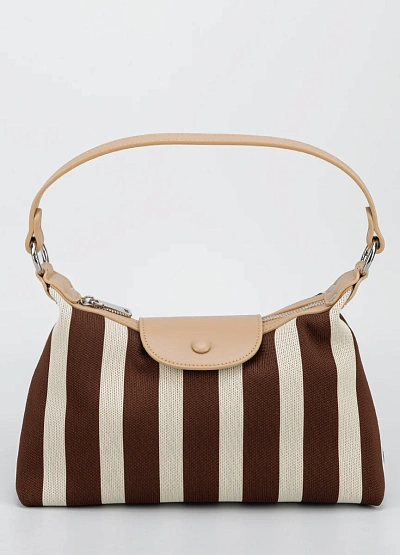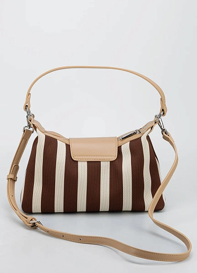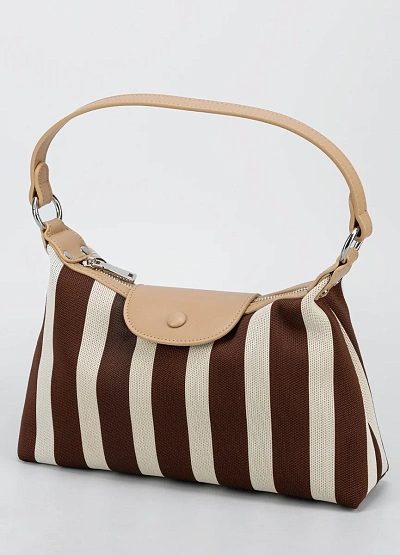 Женская сумка среднего размера в полоску коричневой и бежевой гаммы. Модель оснащена короткой ручкой и клапаном на кнопке, дополнительно имеется молния. Сумка отличается лаконичным дизайном с минималистичными деталями.