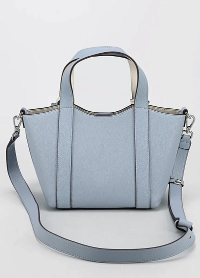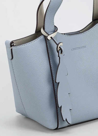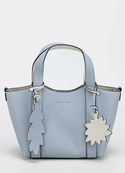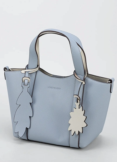 Женская сумка небольшого размера в светло-голубой цветовой гамме. Модель оснащена короткими ручками для ношения в руке и декорирована двумя подвесками в виде фигурных элементов. Сумка имеет лаконичный дизайн с мягкой текстурой поверхности.