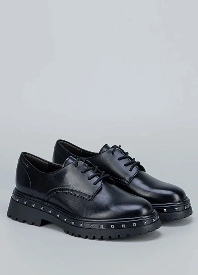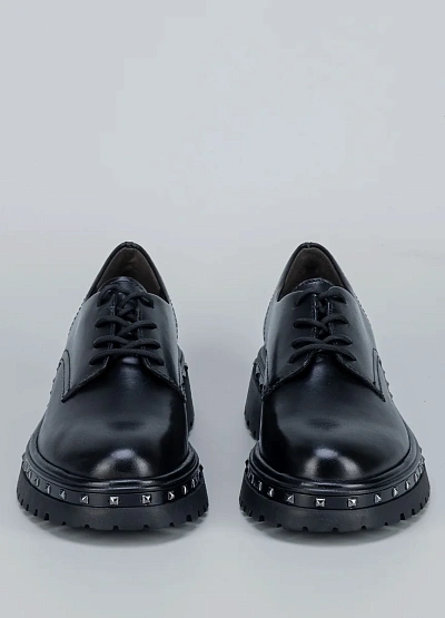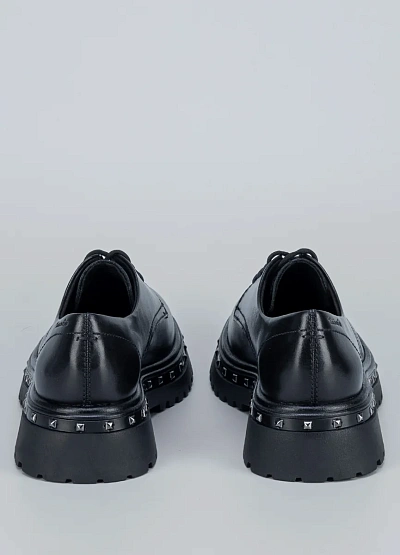 Массивная тракторная подошва и металлические заклёпки придают паре характер. Лаконичный верх из натуральной кожи делает модель универсальной для смелых городских луков.