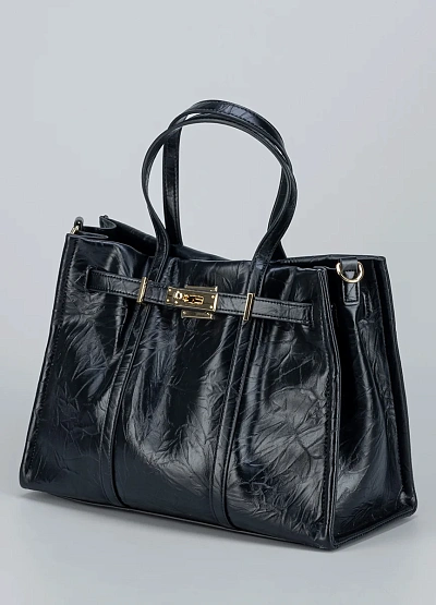 • Компактная сумка Loretta Very строгой формы из глянцевой черной экокожи с фактурной поверхностью и легким блеском. Основное украшение — ремешок с золотистой фурнитурой и декоративным замком, придающим образу элегантность. Идеальный вариант для делового стиля или повседневного выхода.