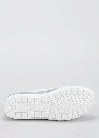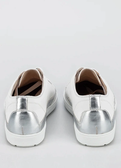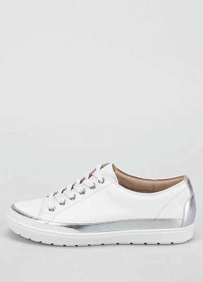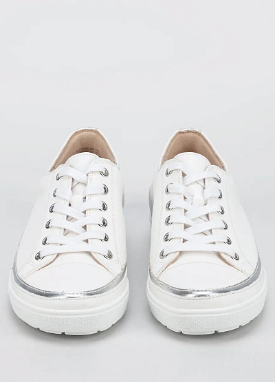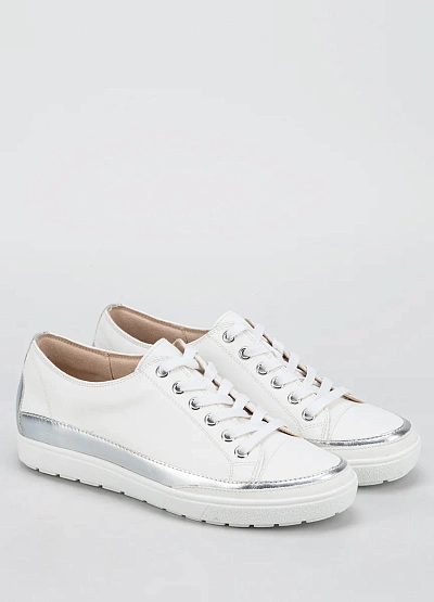 Женские повседневные кеды белого цвета с серебристыми вставками. Модель выполнена в лаконичном стиле с закрытым силуэтом на шнуровке, визуально выделяется контрастными металлическими деталями на пятке и по линии подошвы.