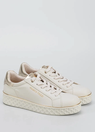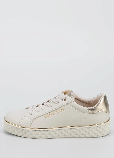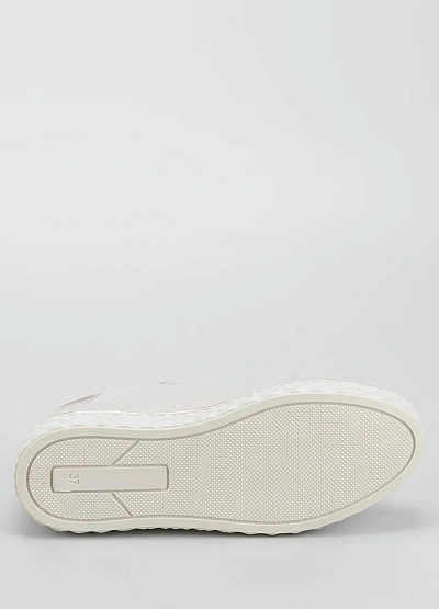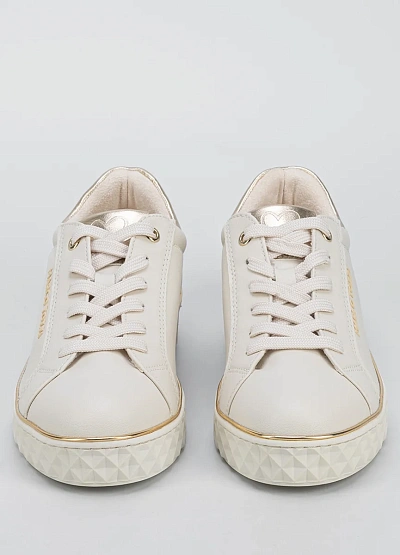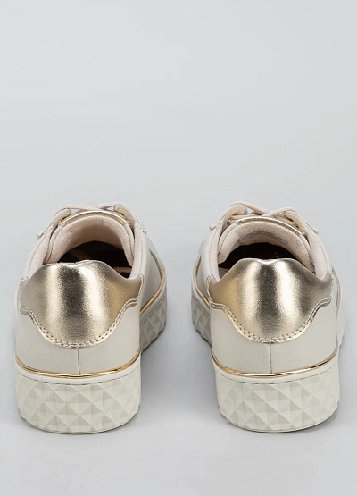 Женские кеды светлого оттенка с акцентом на золотистых деталях. Модель выполнена в спокойной цветовой гамме, с однотонным корпусом и контрастной отделкой на заднике и подошве. Видна плотная шнуровка и светлая подошва с геометрическим рельефом.