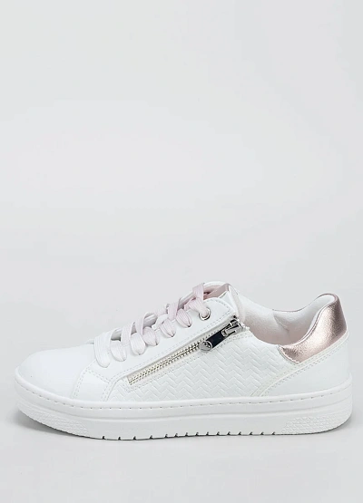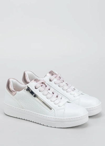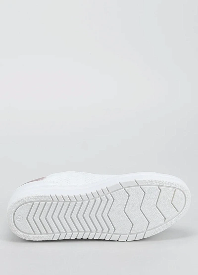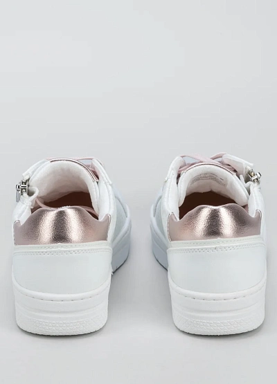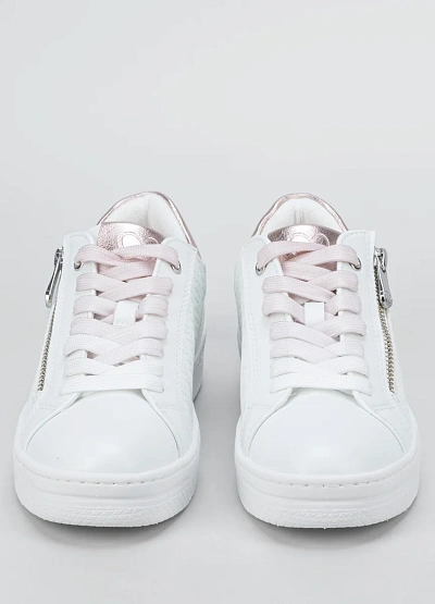 • Женские кеды, выполненные в белой цветовой гамме с элементами светло-розового оттенка. Дизайн модели дополнен металлической молнией сбоку и фактурным тиснением на поверхности. Деталь на пятке выделяется металлизированным розовым цветом.