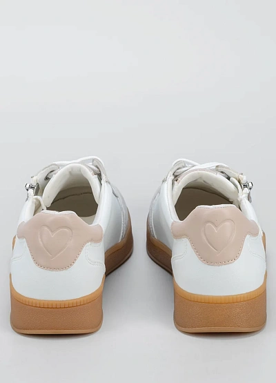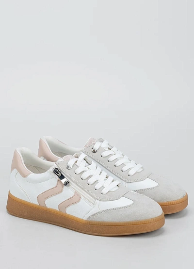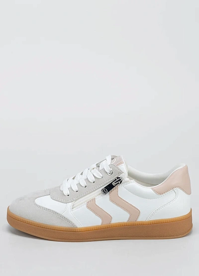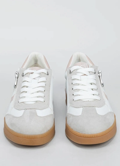 Женские кеды, представлены в светлой цветовой гамме с преобладанием белого, бежевого и серого оттенков. Модель отличается комбинированным дизайном и наличием декоративной молнии сбоку, а также контрастной подошвой.