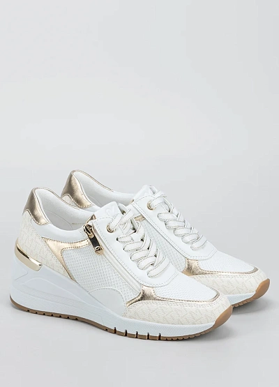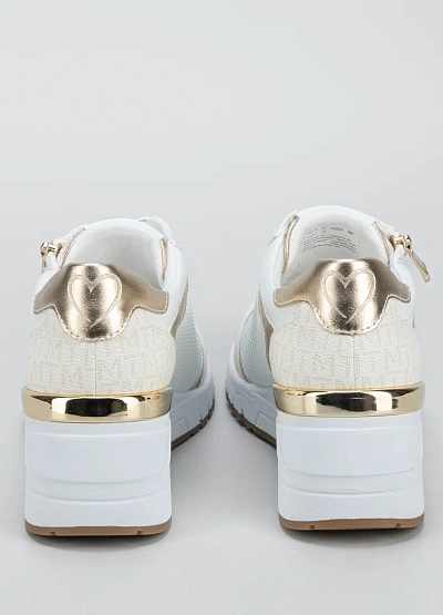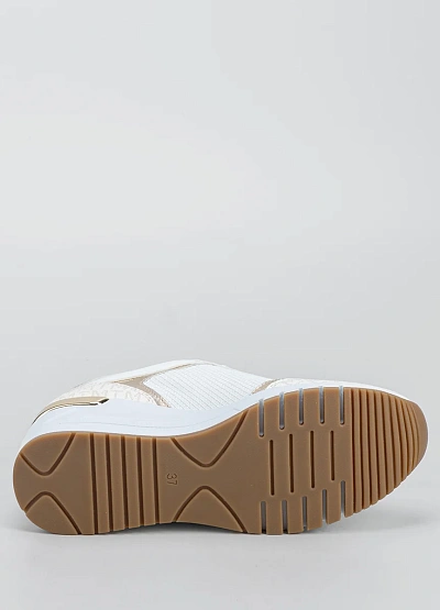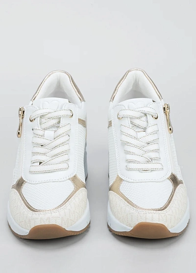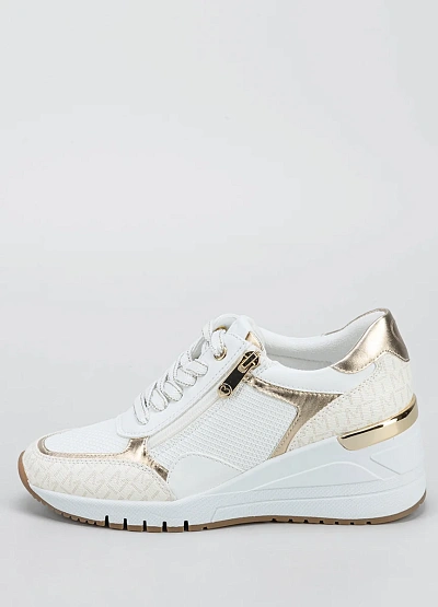 Женские кроссовки выполнены в бело-золотой гамме с комбинированными вставками и деталями. Модель отличается приподнятой подошвой и декоративной молнией сбоку, создавая современный внешний вид и привлекая внимание яркими элементами отделки. Кроссовки имеют классическую шнуровку и заметный акцент на элементы с металлическим блеском.