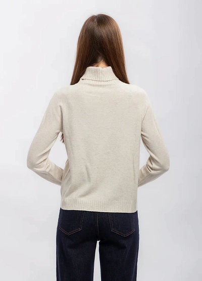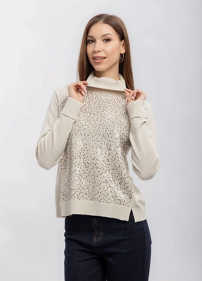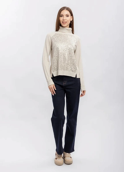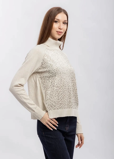 Женский свитер светлого оттенка с декоративной отделкой на передней части. Модель выполнена с длинным рукавом и высоким воротником, имеет свободный крой. Визуальной особенностью выступает мерцающая поверхность спереди.