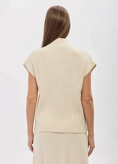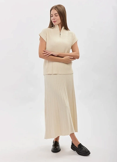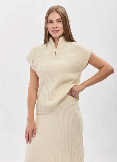 Элегантный трикотажный жилет в молочном оттенке — универсальная модель для утончённых и современных образов. Вертикальная фактурная вязка визуально вытягивает силуэт, а аккуратный воротник-стойка с молнией добавляет образу аккуратный акцент. Свободный крой и отсутствие рукавов делают модель идеальной для многослойных сочетаний в любое время года.