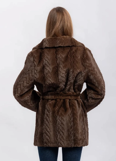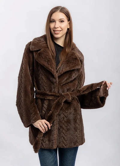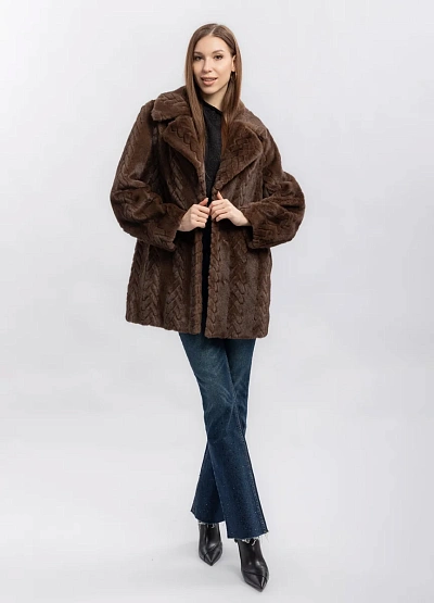 Женская шуба коричневого цвета. Модель выполнена с выразительным узором на поверхности и широким отложным воротником. Цветовая гамма спокойная, изделие выглядит свободно и комфортно.