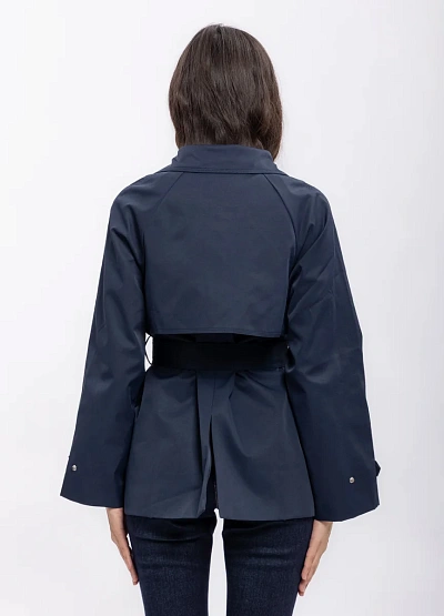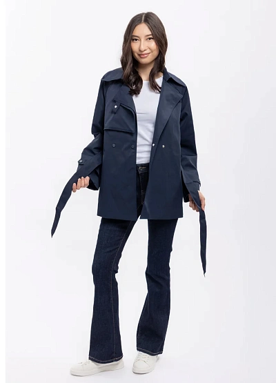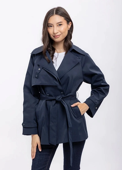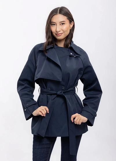 Женский тренч тёмно-синего цвета с поясом предназначен для создания элегантного и современного образа. Модель выполнена в классической цветовой гамме и имеет аккуратный силуэт с акцентом на талии благодаря завязывающемуся поясу и стильным элементам декора.