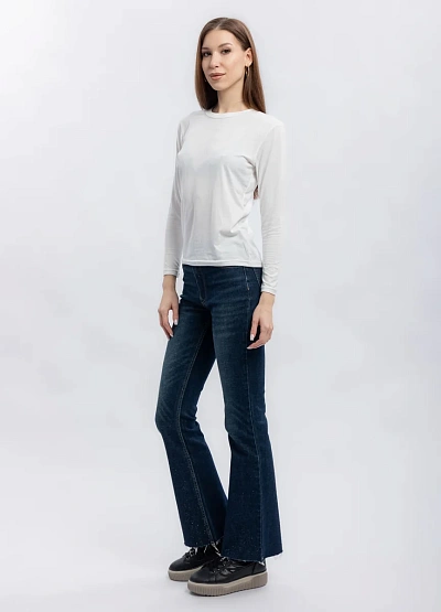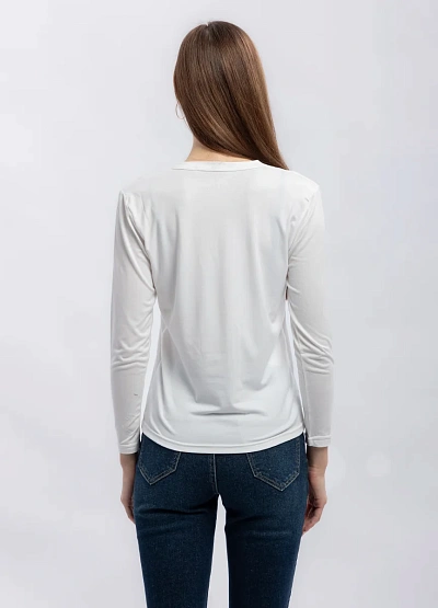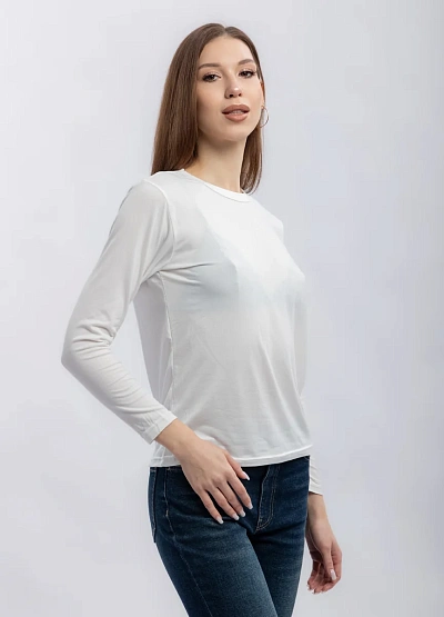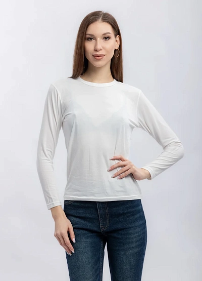 Женский лонгслив с длинным рукавом выполнена в светлой гамме и имеет классический фасон. Модель отличается простотой линий и базовым кроем, что делает её универсальной для повседневной носки.