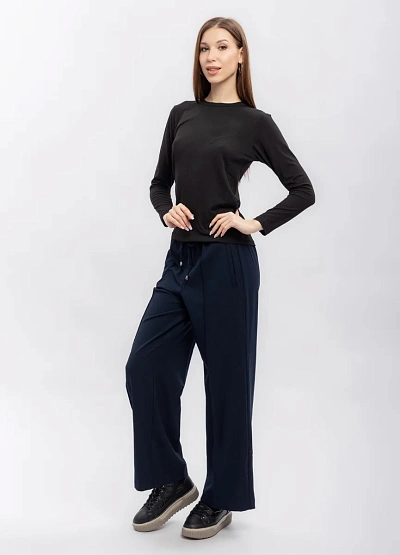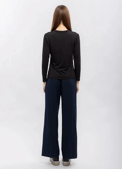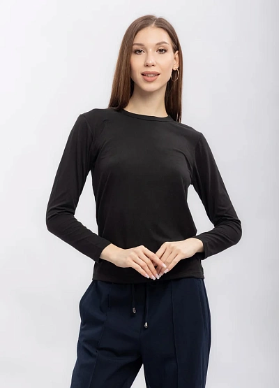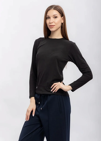Женский лонгслив свободного кроя выполнен в классическом чёрном цвете. Модель с длинными рукавами и округлой горловиной подойдёт для базового гардероба и универсальных сочетаний.