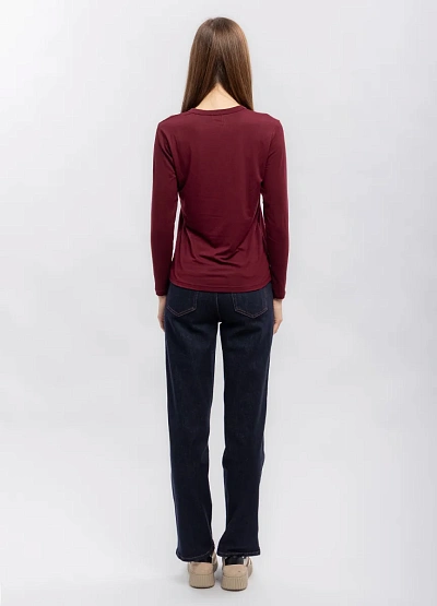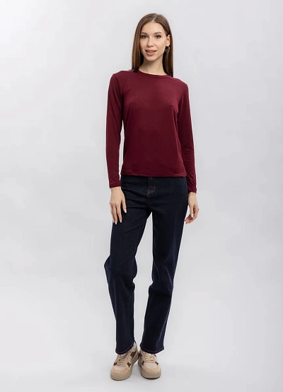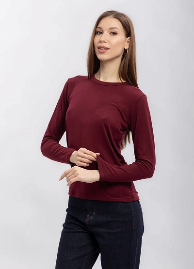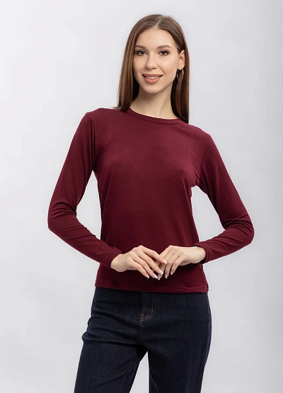 Женская лонгслив с длинными рукавами выполнена в однотонной бордовой гамме. Модель отличается лаконичным дизайном и прямым кроем, без дополнительных декоративных элементов. Изделие хорошо сидит по фигуре и подходит для базового гардероба.