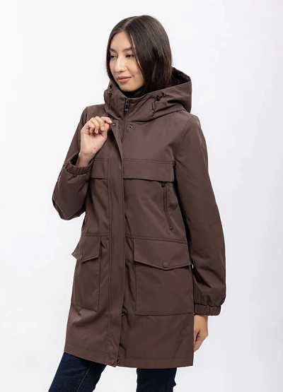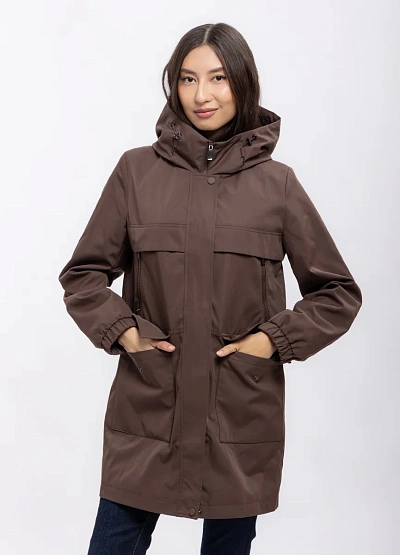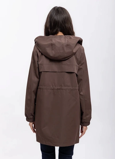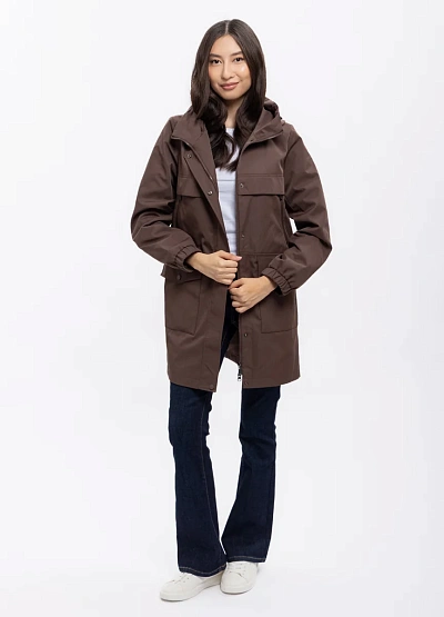 Женская ветровка представлена удлинённой паркой коричневого цвета. Модель оснащена капюшоном со шнурками, застёгивается на молнию с клапаном, имеет вместительные накладные карманы и прямой силуэт.