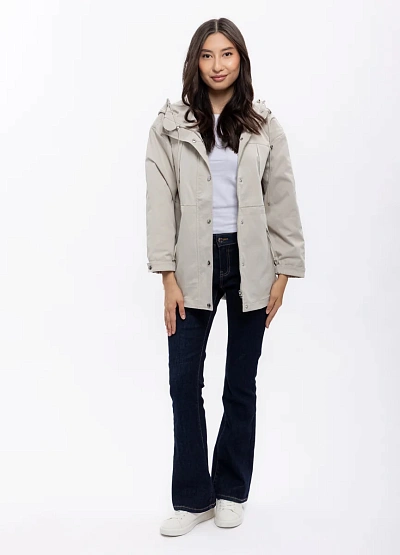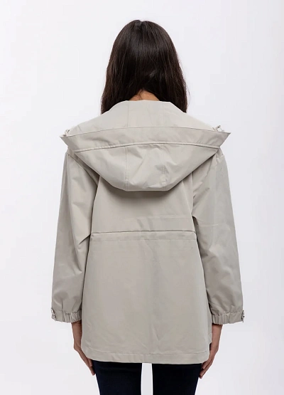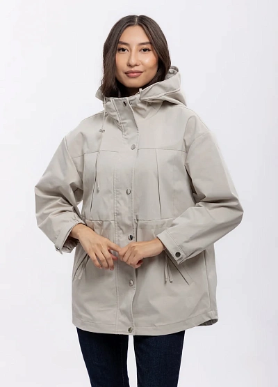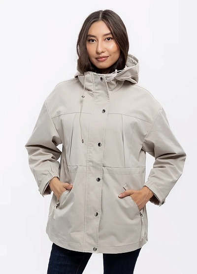 Женская ветровка светло-бежевого оттенка. Модель выполнена в свободном крое с длинными рукавами и капюшоном, застегивается на пуговицы и молнию. Имеет лаконичный дизайн и функциональные карманы на молнии.