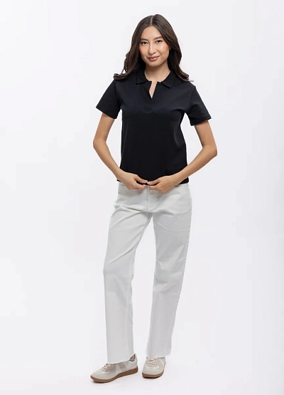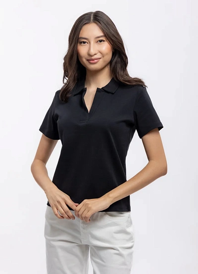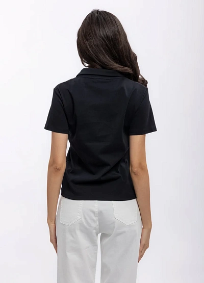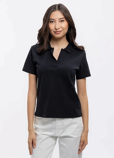 Женская футболка-поло чёрного цвета с короткими рукавами. Модель выполнена в минималистичном стиле, имеет прямой крой и отложной воротник без видимой застёжки.