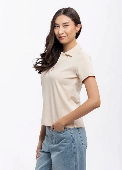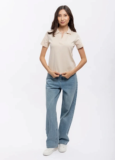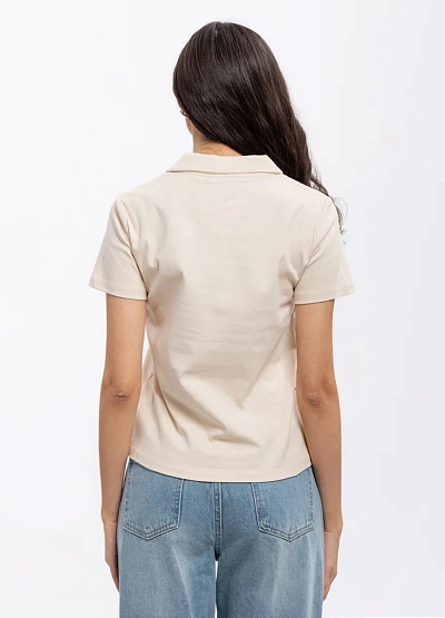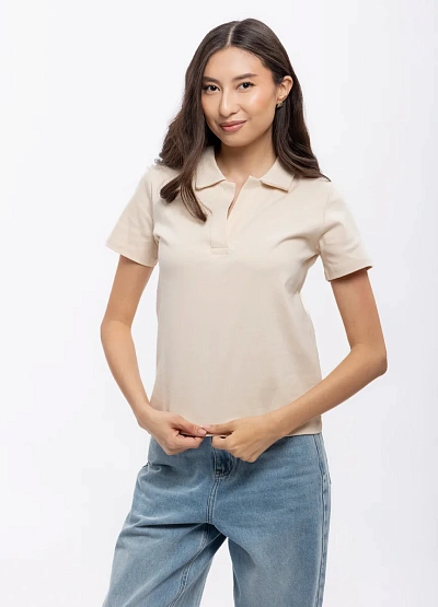 Женская футболка-поло светлого бежевого оттенка выполнена в лаконичном стиле. Модель с короткими рукавами и классическим отложным воротником, без видимых декоративных элементов.