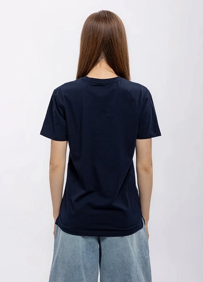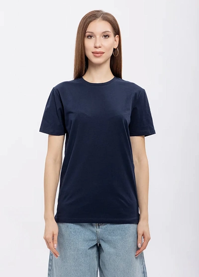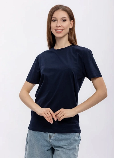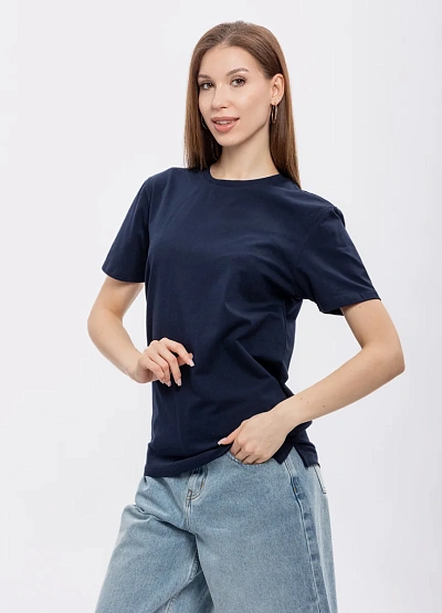 Женская футболка прямого кроя выполнена в однотонной тёмно-синей гамме. Модель имеет классическую круглую горловину и короткие рукава, выглядит лаконично и универсально.
