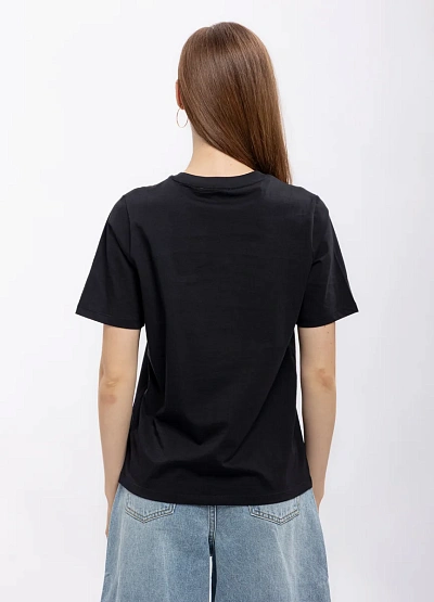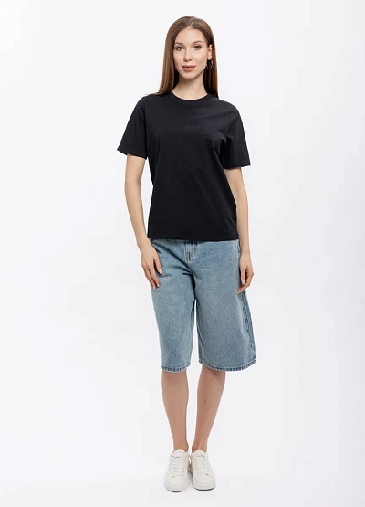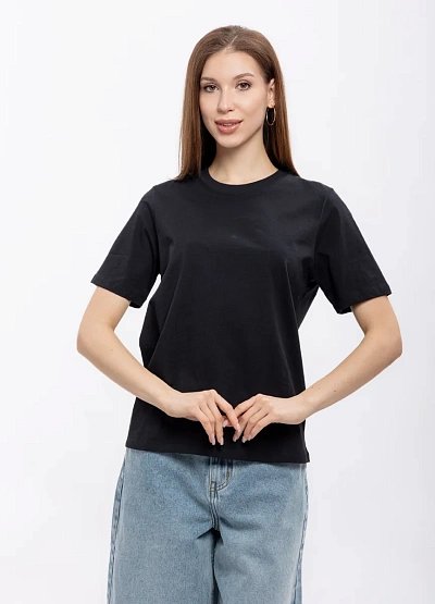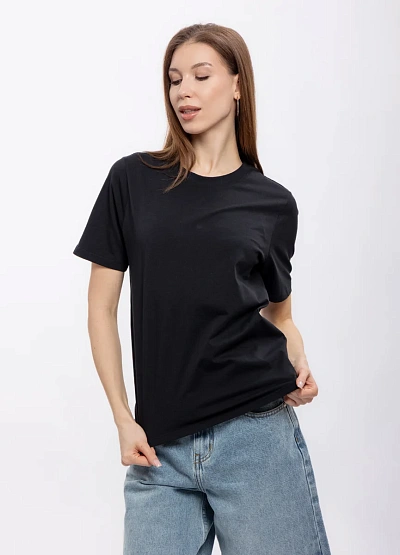 Женская футболка прямого кроя выполнена в классическом черном цвете. Изделие имеет короткие рукава, круглый вырез горловины и минималистичный дизайн без дополнительных элементов.