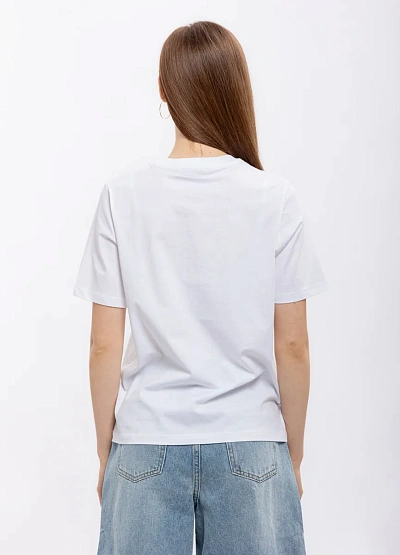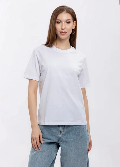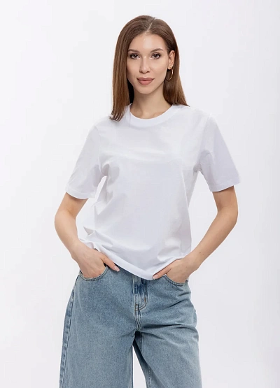 Женская футболка свободного кроя в белой цветовой гамме. Модель отличается классическим круглым вырезом и короткими рукавами, что делает её универсальной на каждый день.