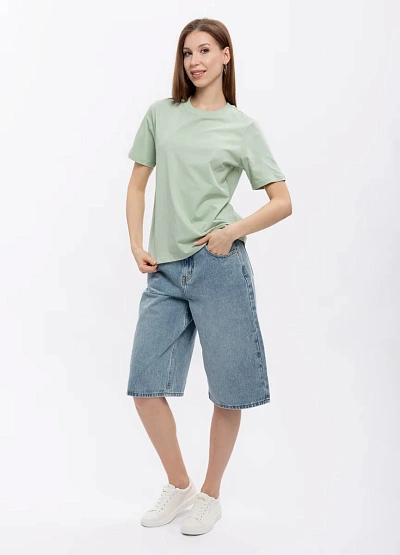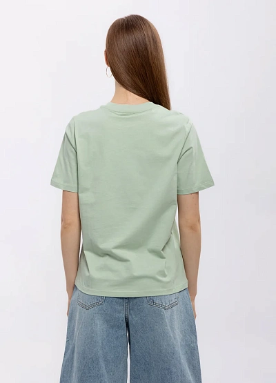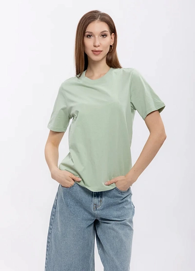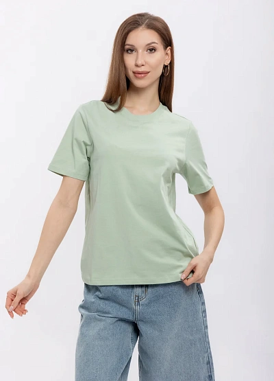 Женская футболка свободного кроя в светло-зелёной цветовой гамме. Модель с коротким рукавом и круглым вырезом выглядит лаконично и универсально, подходит для ежедневных образов.