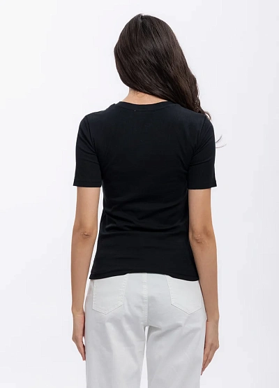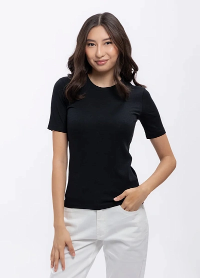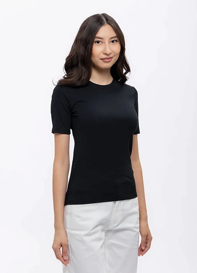 Женская футболка черного цвета с короткими рукавами отличается классическим кроем и лаконичным дизайном. Однотонная расцветка и округлый вырез горловины придают модели универсальный вид, делающий ее подходящей для различных случаев.