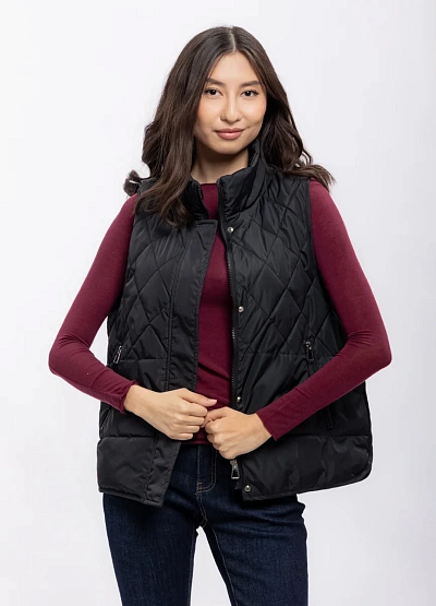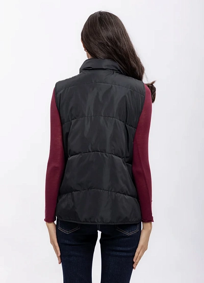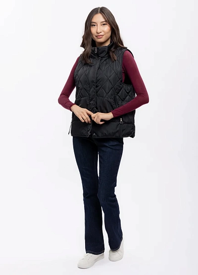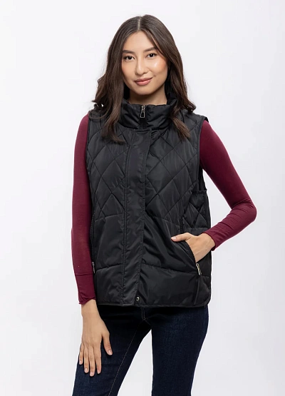 Женский жилет черного цвета с алмазной простежкой выполнен в классическом стиле. Модель имеет высокую горловину и застегивается на молнию, что видно на фото. Благодаря универсальному крою изделие легко сочетается с различными элементами гардероба.