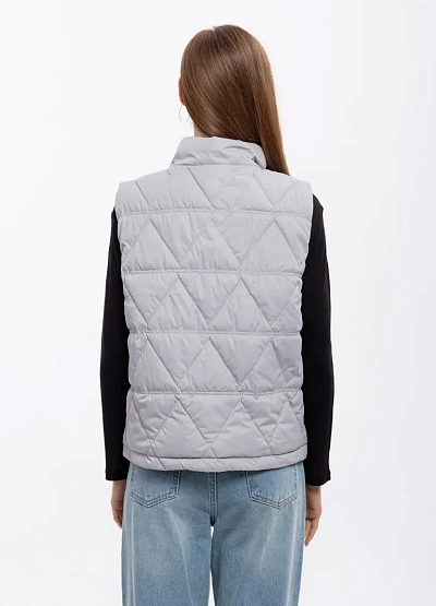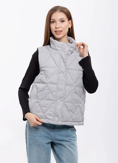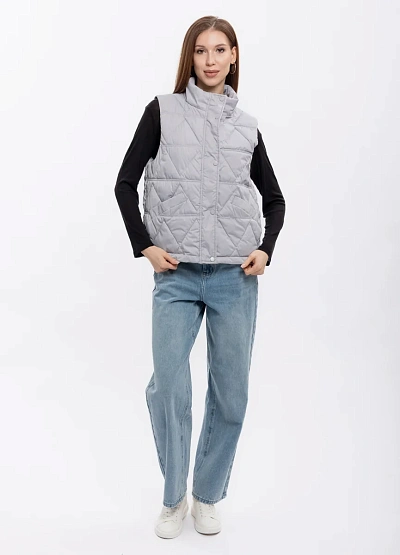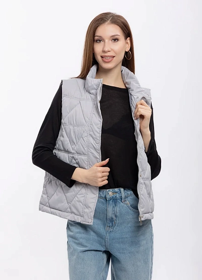 Женский жилет светло-серого цвета на молнии. Модель с высоким воротником и стеганым узором, без рукавов, подойдет для повседневного образа и создает легкий акцент в комплектации одежды.