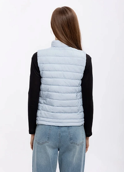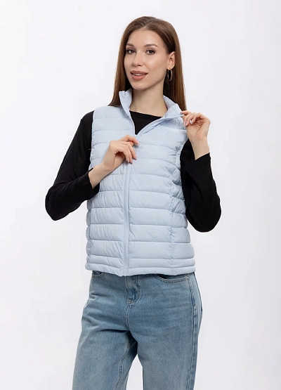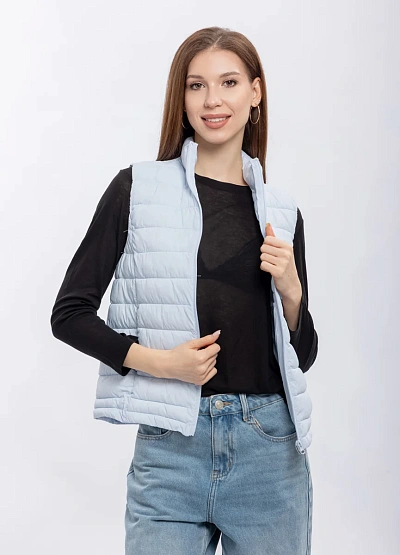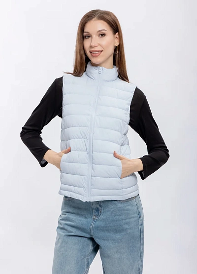 Женский жилет светлого голубого цвета с горизонтальной стежкой. Модель без рукавов, с воротником-стойкой и застёжкой на молнию. Цветовая гамма изделия — однотонная, светлая.