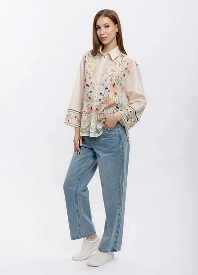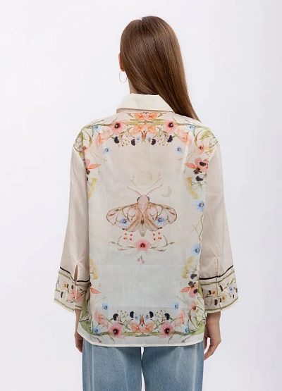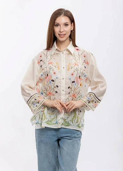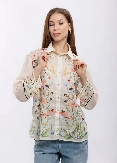 Женская рубашка свободного кроя в светлой цветовой гамме с многоцветным флоральным принтом. Модель имеет длинные рукава и застёжку на пуговицы, особенности которой — выразительный рисунок и прозрачная структура ткани.